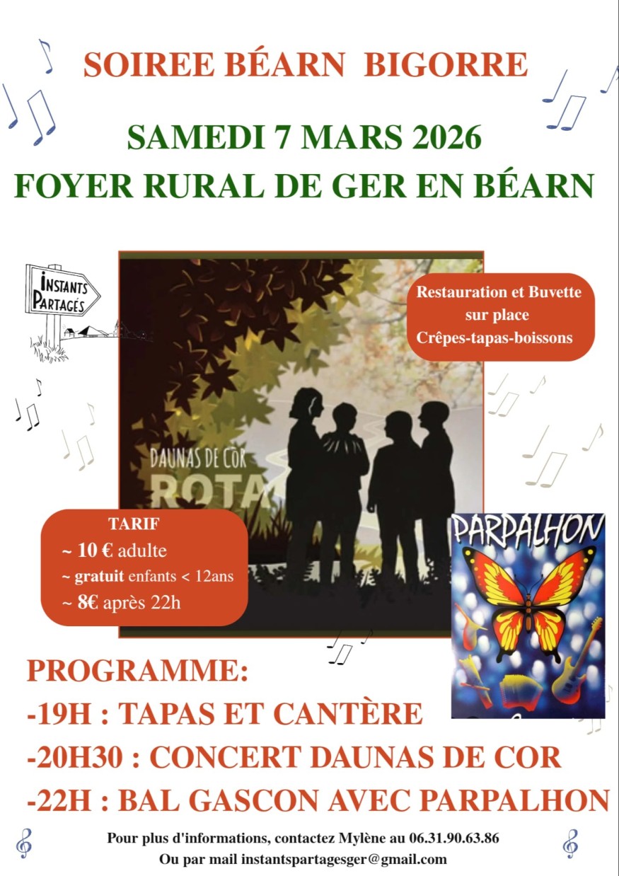 L’association Instants Partagés de Ger vous invite à une grande soirée conviviale autour des chants polyphoniques, de la musique et de la danse, au profit de ses actions locales.Une belle occasion de partager un moment festif tout en soutenant la vie associative