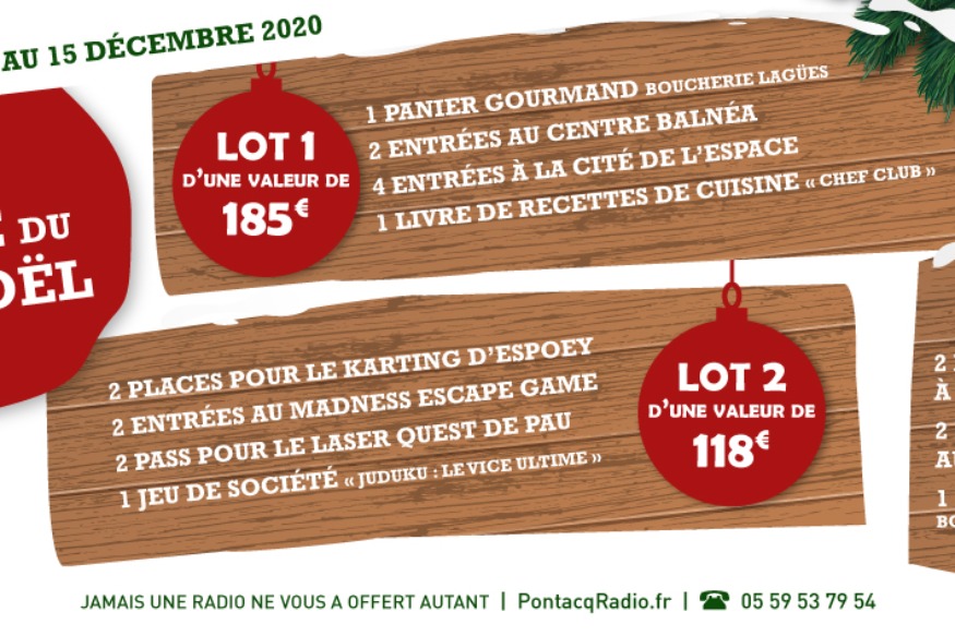 Cette année encore, Pontacq Radio vous propose de braquer l'un des lots de la Hotte du Père-Noël ! Pour peut-être gagner l'un des trois lots suivants, connectez-vous à votre compte Facebook et : - Likez cette publication ;- Commentez cette publication en invitant vos amis ; - Partagez cette publication en mode "Public" sur votre profil ;- Likez la page Facebook de Pontacq Radio. EN JEU CETTE ANNÉE : Lot n°1 :- 1 panier gourmand remis par la Boucherie Lagües de Pontacq.- 2 entrées au centre Balnéa de Genos-Loudenvielle.- 2 entrées adultes + 2 entrées enfants à la Cité de l’Espace......